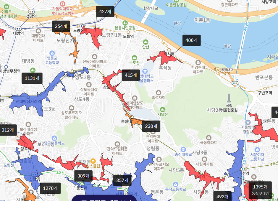 한강뷰가 나온다는 이유 하나만으로 아파트 가격은 천정부지로 치솟습니다. 한강 주변의 아파트를 재건축할때는 전 세대 한강뷰를 조망할수 있게 만들수 있느냐가 재건축/재개발 조합원이 건설사를 선택하는 기준이 되기도 합니다. 또한 같은 아파트 단지여도 한강뷰가 나오는 동과, 한강뷰가 없는 동의 가격차이는 심하면 10%이상씩 차이나기도 합니다.